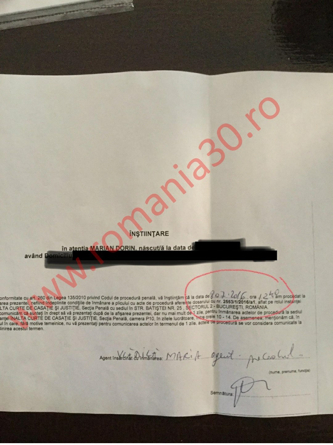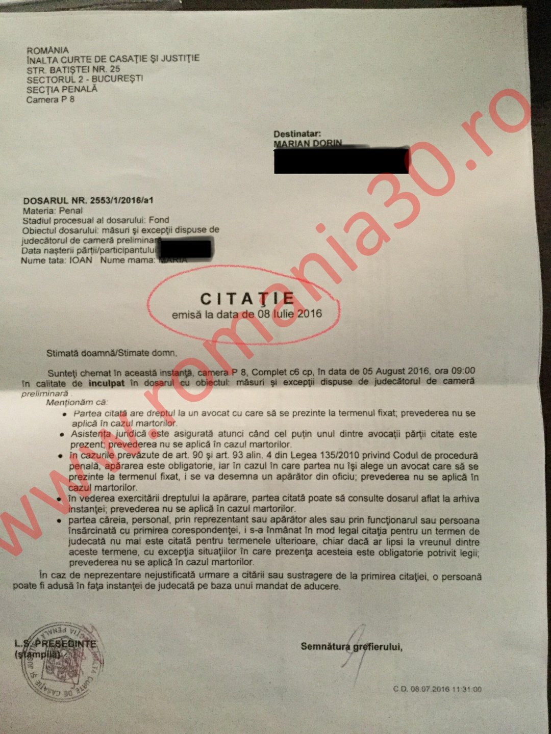La 08.07.2016 dosarul e deja la Înalta Curte de Casație și Justiție și se emite deja citație, în aceeași zi.