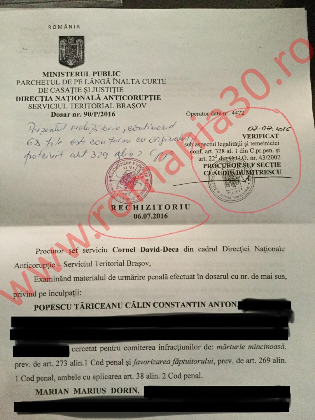 Sute de pagini de rechizitoriu și peste 20.000 de file de dosar. Rechizitoriul a fost aprobat cu o zi înainte să fie întocmit. - Imediat ulterior, la 06.07.2016, se întocmește rechizitoriul în dosarul Tăriceanu – Dorin Marian.