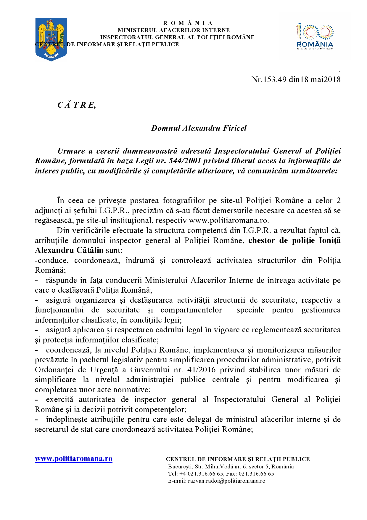Prin adresa nr.153.49 din18 mai2018, IGPR-ul ne arată imixtiunea conducerii IGPR-ului nu doar în „dosarele sensibile” aflate pe rolul unităților de parchet și instanțelor de judecată ci, mai ales, că această „unitate centrală” a Poliției imixtionează, nepermis, în actul de Justiție (fila 2):  „planifică activităţile proprii şi le coordonează pe cele specifice structurilor subordonate, intervenind cu completări şi măsuri suplimentare acolo unde se impune” (este doar un exemplu evidențiat în adresa de maisus).