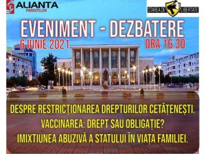 AlianÈa PÄrinÈilor, Starea de Libertate Èi FrÄÈia OrtodoxÄ Sfântul Gheorghe purtÄtorul de biruinÈÄ vor organiza în ziua de duminicÄ, 6 iunie, de la ora 16:30 în faÈa Casei de CulturÄ a oraÈului BacÄu, un eveniment -dezbatere despre situaÈia drepturilor Èi libertÄÈilor cetÄÈeneÈti, sever afectate în perioada pandemiei.