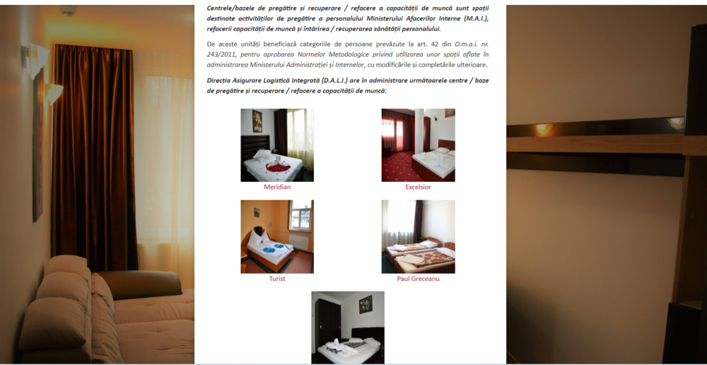 Dacă nu ați știut, aflați că M.A.I. și-a deschis ofertele de cazare pe site, cu două unități de cazare indisponibile, la Hotel Diana din Mamaia și Paul Greceanu de la București, care se află în renovare. Accesul și înscrierea pe site-ul MAI Booking (!) se face prin logare, folosind seria și numărul de legitimație și prima pagină de deschidere te îndeamnă să-ți faci viza SUA. Trecem peste prostia asta și ajungem la hoteluri.
