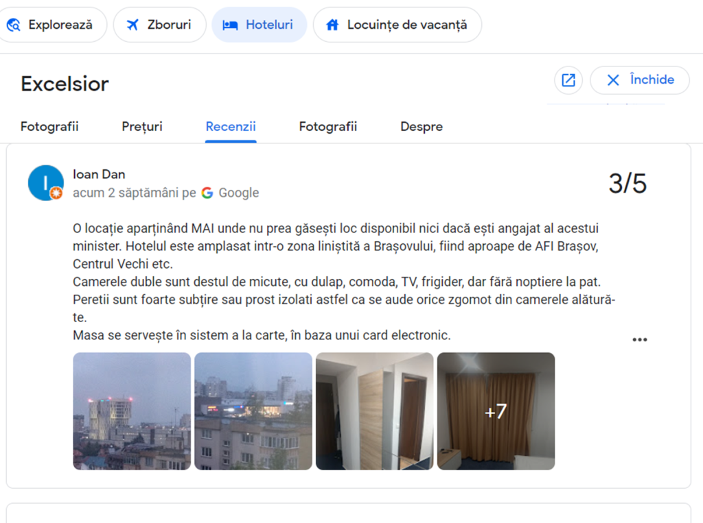 Întrebarea rămâne, totuși în picioare: pentru cine și ce scop sunt blocate ”centrele de recuperare și refacere a capacității de muncă a personalului MAI”? Ori au devenit locuri de refugiu ale înzorzonaților din aparatul central, cu patimi omenești și mari nevoitori de o cămeruță lângă ”un suflet cald”, feriți de ochii curioșilor? O recenzie vine să ne confirme – pe lângă altele – și această ultimă bănuială, Excelsior din Brașov e foarte aproape de Centrul Vechi (deci o plimbare romantică de seară e asigurată!), însă are pereții mult prea subțiri și se cam aude scârțâitul patului.