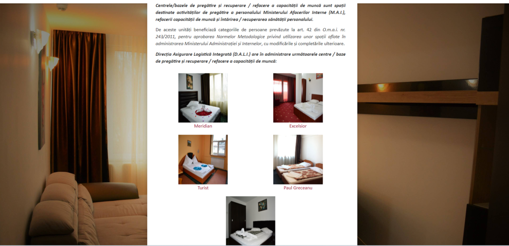 Dacă nu ați știut, aflați că M.A.I. și-a deschis ofertele de cazare pe site, cu două unități de cazare indisponibile, la Hotel Diana din Mamaia și Paul Greceanu de la București, care se află în renovare. Accesul și înscrierea pe site-ul MAI Booking (!) se face prin logare, folosind seria și numărul de legitimație și prima pagină de deschidere te îndeamnă să-ți faci viza SUA. Trecem peste prostia asta și ajungem la hoteluri.