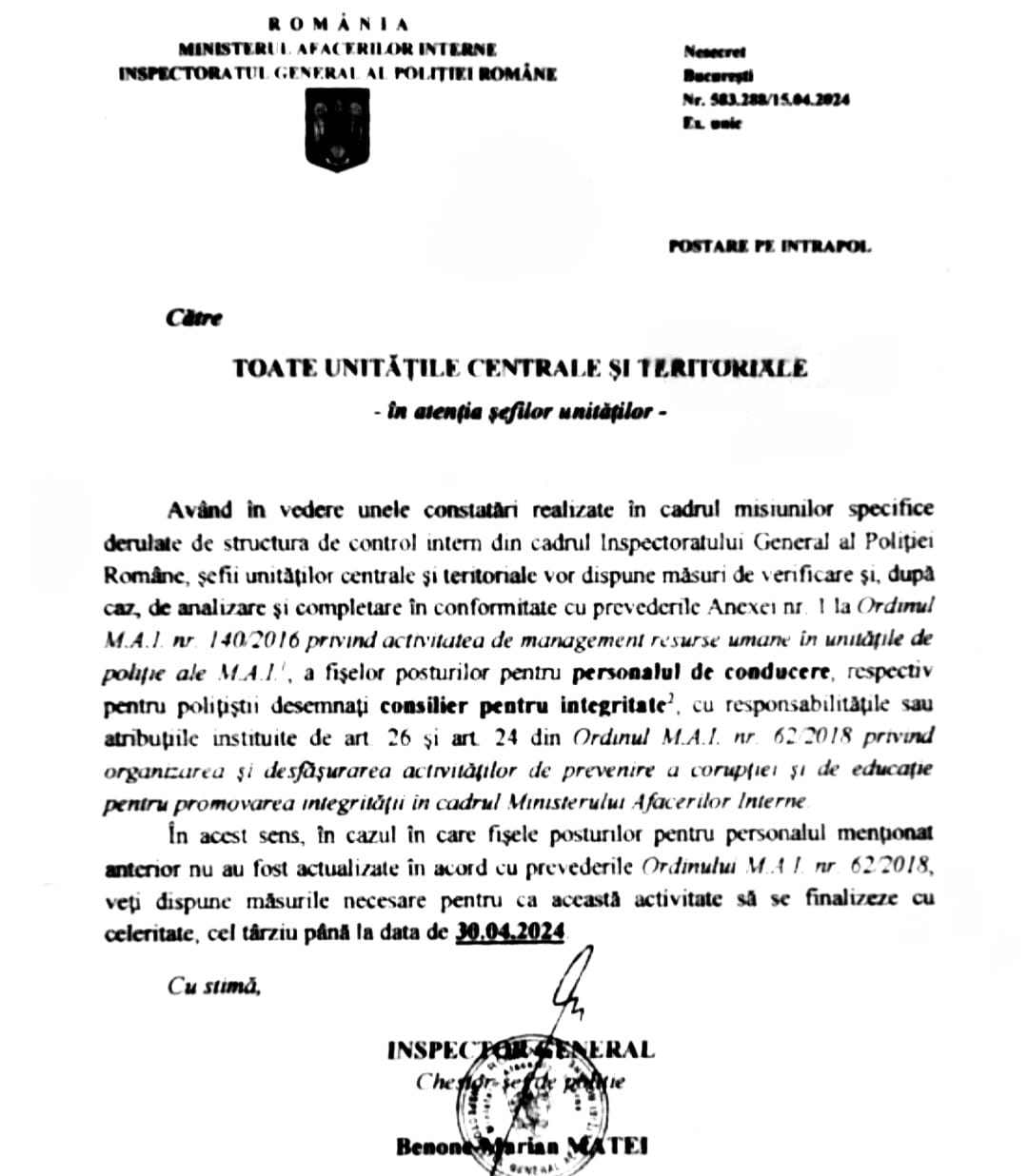 Astfel, IGPR a solicitat unităților teritoriale subordonate ca acest proces să fie realizat până cel târziu la data de 30.04.2024, așa cum rezultă și din conținutul adresei de mai jos.